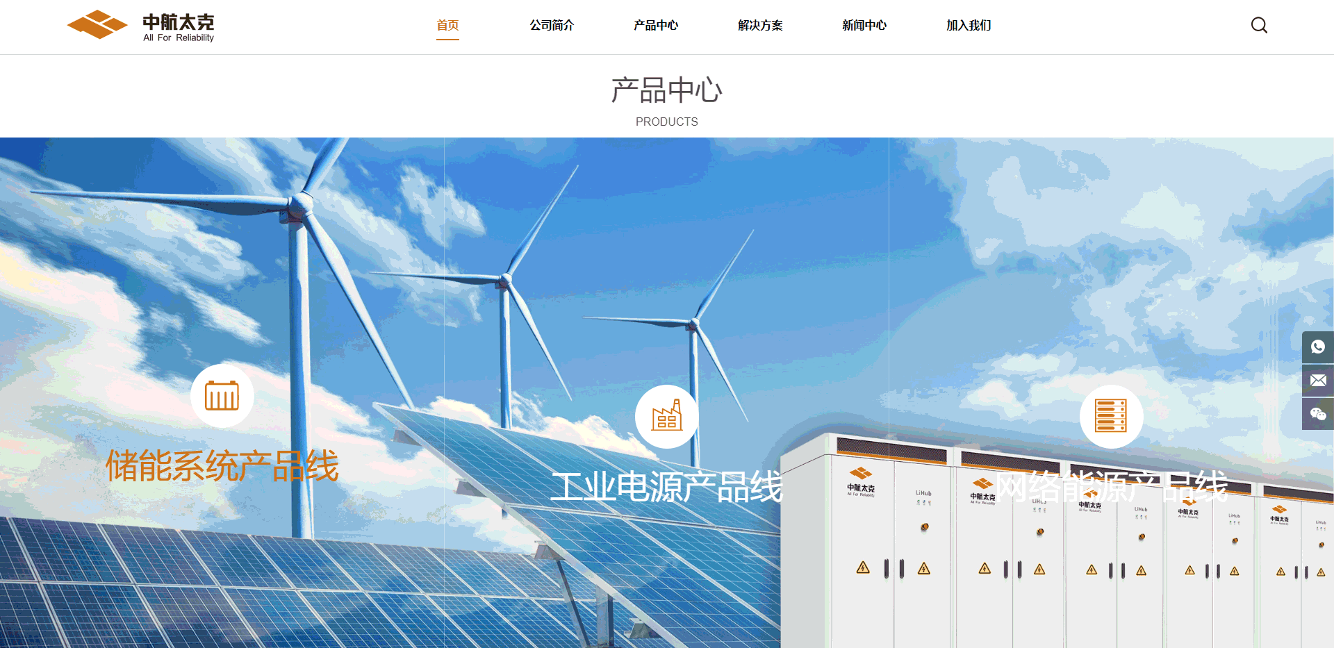 产品中心以储能系统、工业电源、网络能源三大产品线为基础,呈现了产品整体外观、主要规格参数情况,针对行业现状及痛点,优化了解决方案和典型案例。中航太克依托自身的技术水平及品牌优势,满足了不同市场的各项需要。