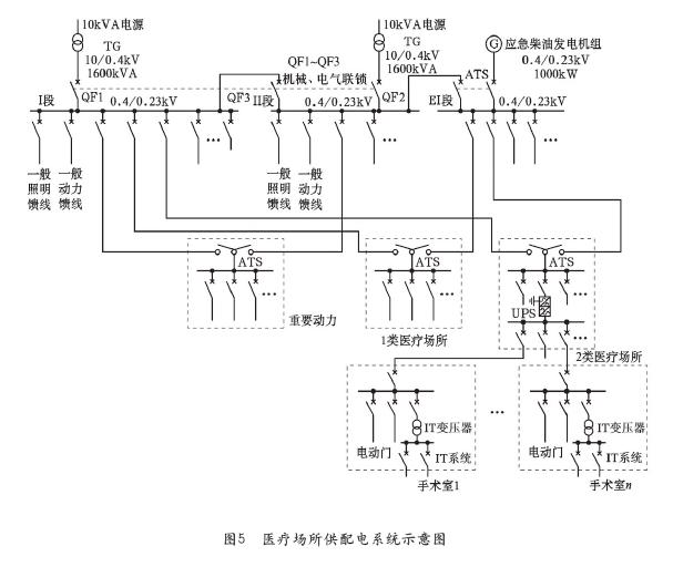 为满足一级负荷中特别重要负荷的供电,根据规范的需求应设置应急电源。采用柴油发电机组作为第三电源,详见图5所示。一级负荷采用两路市电自动切换后供电,ATS(双电源自动转换开关)从接收指令到完成指令,一般转换时间在1s内,可满足规范要求。但对于一级负荷中特别重要的负荷,如手术室、ICU、重症监护病房、抢救室等,虽有发电机组作为第三路应急电源,但其起动时间一般在15s内,尚不能满足该类负荷恢复供电时间(t<0.5s)的要求,故还需设置工业型UPS作为应急柴油发电机组起动时的不间断电源。根据负荷分布的特点,采用集中与分散相结合的方式设置工业型UPS不间断电源。在手术室的技术层内,由于一级负荷中特别重要的负荷比较集中,设置了手术室、ICU、CCU、重症监护病房的工业型UPS,该套工业型UPS纳入电能管理,方便医院的管理。首层急诊抢救室距离手术室设备层较远,如果将UPS设置于手术室的设备层内,线路较长,损耗较大,不经济,应在其就近配电间内设置抢救室的专用的工业型UPS。检验科内有大型生化仪器类负荷,其负荷等级并不属于一级负荷中特别重要的负荷,不需另设应急电源,但其允许恢复供电时间很短(t<0.5s),市电切换时间不能满足其工艺要求,故仍需设置不间断电源,因此,检验科内设置了专供大型生化仪器使用的工业型UPS。对于病房内大量分散使用呼吸机的情况,设置集中的工业型UPS不经济,也不现实,因此如病房呼吸机类分散的小容量重要设备,设计时要求在使用中采用移动式工业型UPS。
