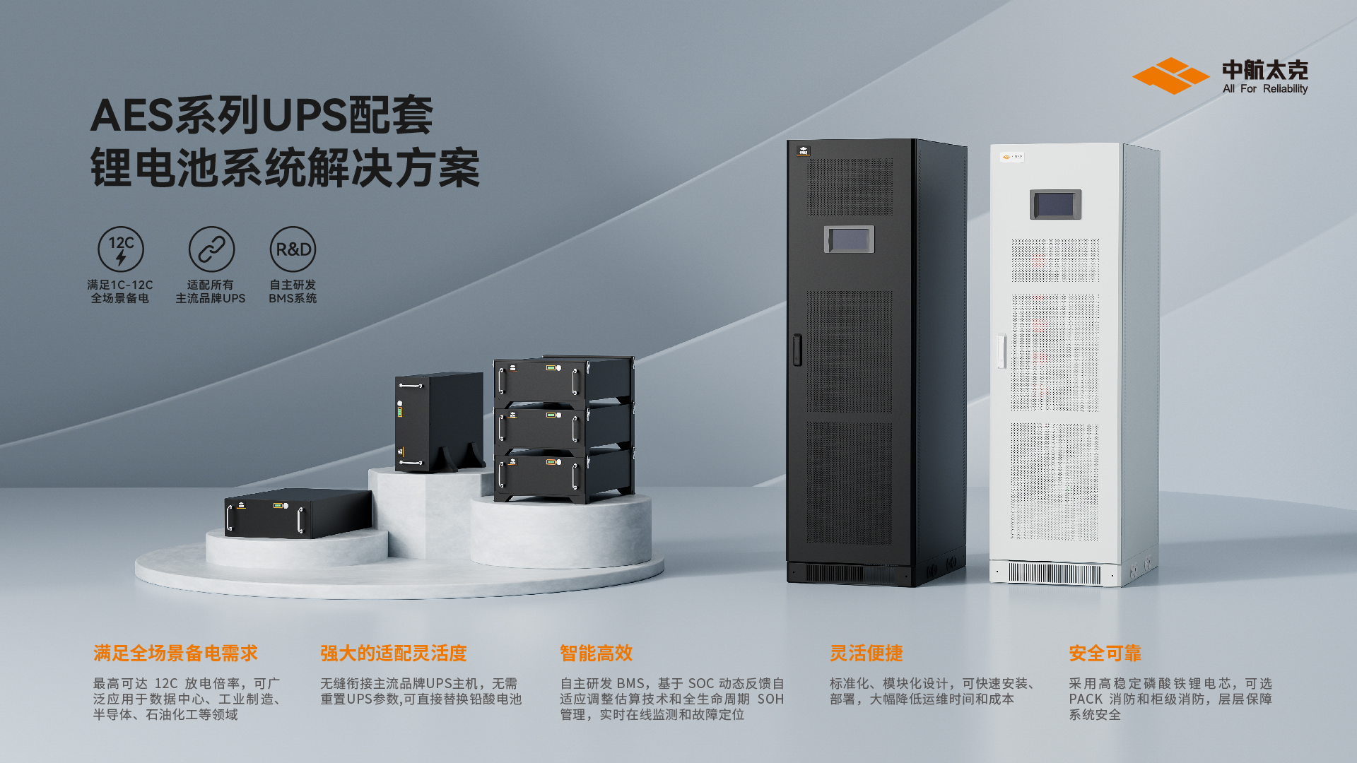 锂电池作为一种重要的能源存储设备,在各个领域发挥着关键作用。中航太克自研自产的AES-U系列UPS配套锂电池系统最高可达12C放电倍率,具有满足全场景备电需求、强大的适配灵活度、自主研发的BMS管理系统等优势亮点,为用户打造安全可靠、绿色节能、智能管理的一体化服务。