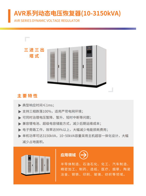 目前,中航太克AVR系列动态电压恢复器单机容量已达3150kVA,这是国内单机最大容量,现已在半导体行业投放运行,保证了用户的生产线负荷免受电压暂降的影响。AVR系列动态电压恢复器备受半导体制造、石油石化、化工、汽车制造、精密加工、制药、造纸、医疗卫生、科研院所、烟草、陶瓷、冶金、钢铁、印刷、玻璃、纺织等行业关注。