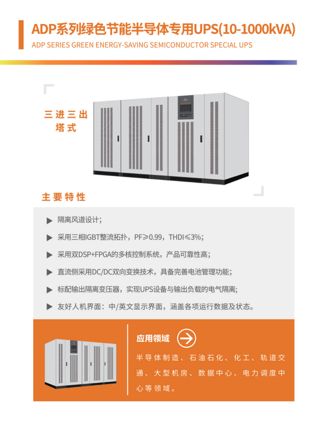 工业电源产品线中ADP系列绿色节能半导体专用UPS,特为工业环境而设计的绿色电源。采用SVPWM空间脉宽调制技术与有源功率因数校正技术,兼具单位功率因数与低输入谐波电流特征,满足了新一代绿色环保电源的需求。