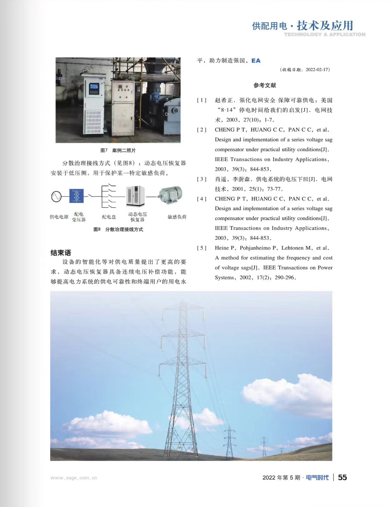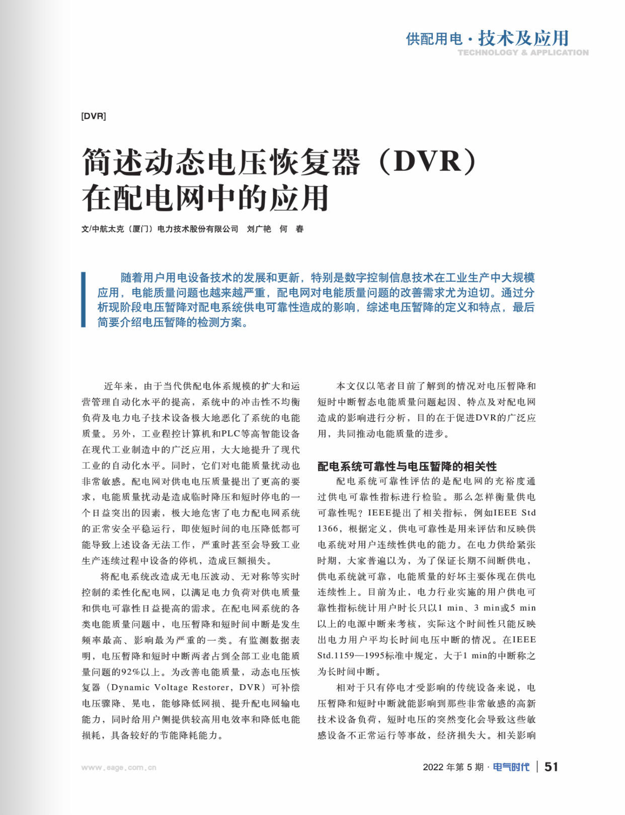 随着用户用电设备技术发展和更新,数字控制信息技术在工业生产中大规模应用,因此,配电网对电能质量问题的改善尤为迫切。中航太克在《电气时代》中刊登了动态电压恢复器在供配用电网中的应用相关学术文章,该文章论述了应用可改善电能质量,提升输电能力、降低电能损耗、节能减排,极大提升了现代工业的自动化水平。