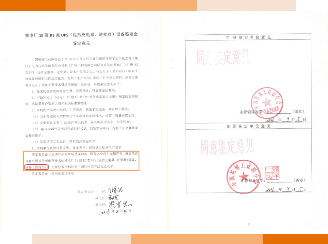 中航太克技术团队,自主创新,攻坚克难,研制出符合核电标准要求的ANP系列核电专用电源产品,完成了9大类100余项的认证试验,并于2016年8月通过国家专家组鉴定。2017年获得国家核安全局颁发的民用核安全电源设备设计和制造许可证,该产品的成功研制有效推动了核电国产化进程,提升了整体产化率,对行业具有重要意义。