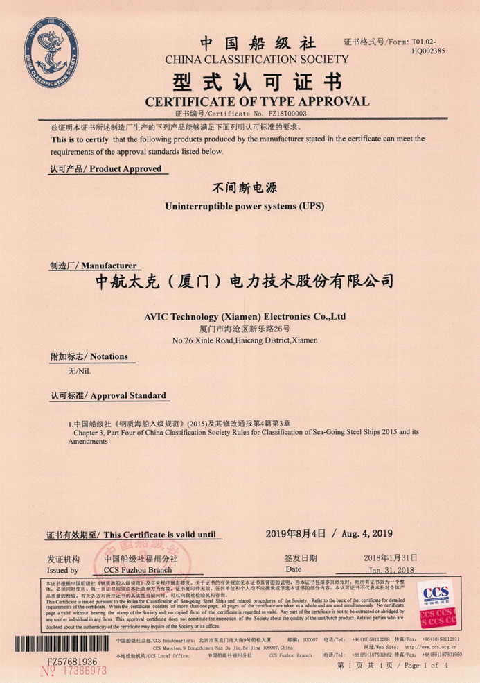 近期,中航太克(厦门)电力技术股份有限公司(简称“中航太克”)自主设计、研发、生产的AHP系列海工专用UPS产品再获中国船级社(简称“CCS”)型式认可证书。