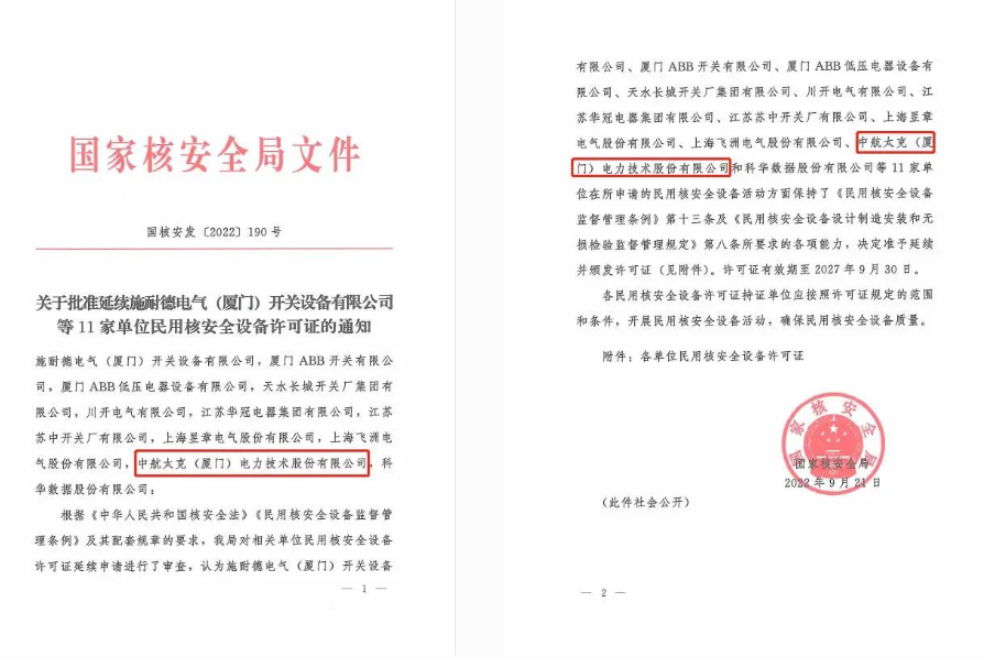 党的十八大以来,中航太克始终坚持以习近平新时代中国特色社会主义思想为指导,抢抓“双碳”背景下的核电发展历史机遇期。在这举国同庆的时刻,中航太克获得了国家核安全局的民用核安全设备许可证续证批文,向伟大祖国七十三华诞献礼。